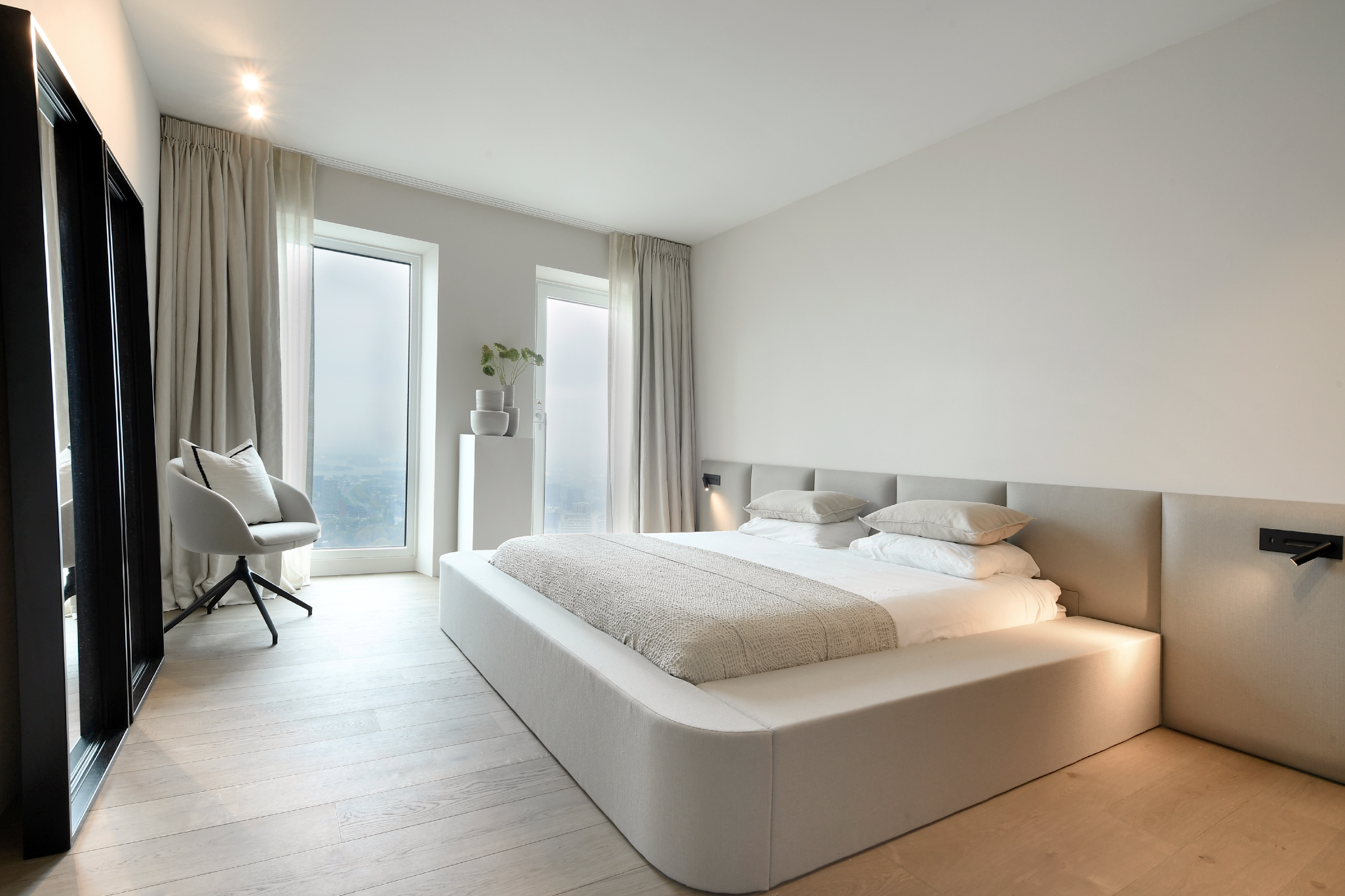 Bij dit luxe penthouse gelegen aan de Gedempte Zalmhaven in Rotterdam is er gekozen voor een op maat gemaakt Sander bed. In de afwerking is er gebruik gemaakt van een breed hoofdbord en curved voetbord gestoffeerd in canvas katoen. Als finishing touch zitten er uitsparingen in verwerkt met luxe bedlampjes voor een tijdloos design.